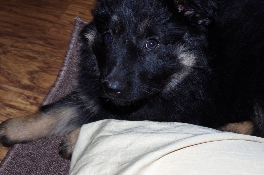 Rae is 5 months old. She has enormous paws & weighs 35 pounds already. When she was free to roam in her new backyard the grass thrilled her. (So did my garden) She makes me smile. My heart has expanded. Rae owns her space there now.